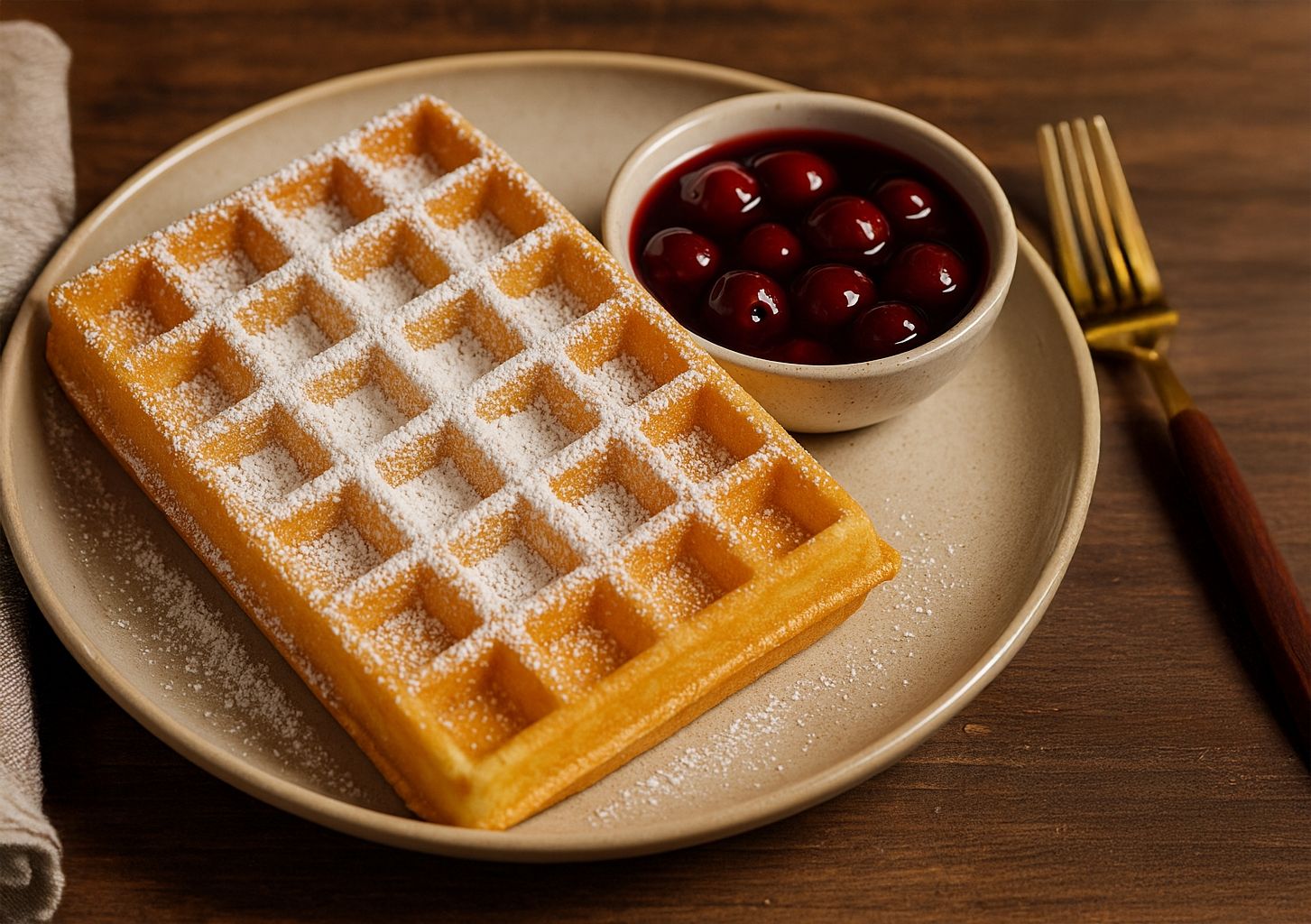 Genießen Sie unsere frischen Waffeln, die mit Puderzucker, Apfelmus oder Kirschkompott serviert werden. Diese süße Versuchung ist perfekt für zwischendurch.